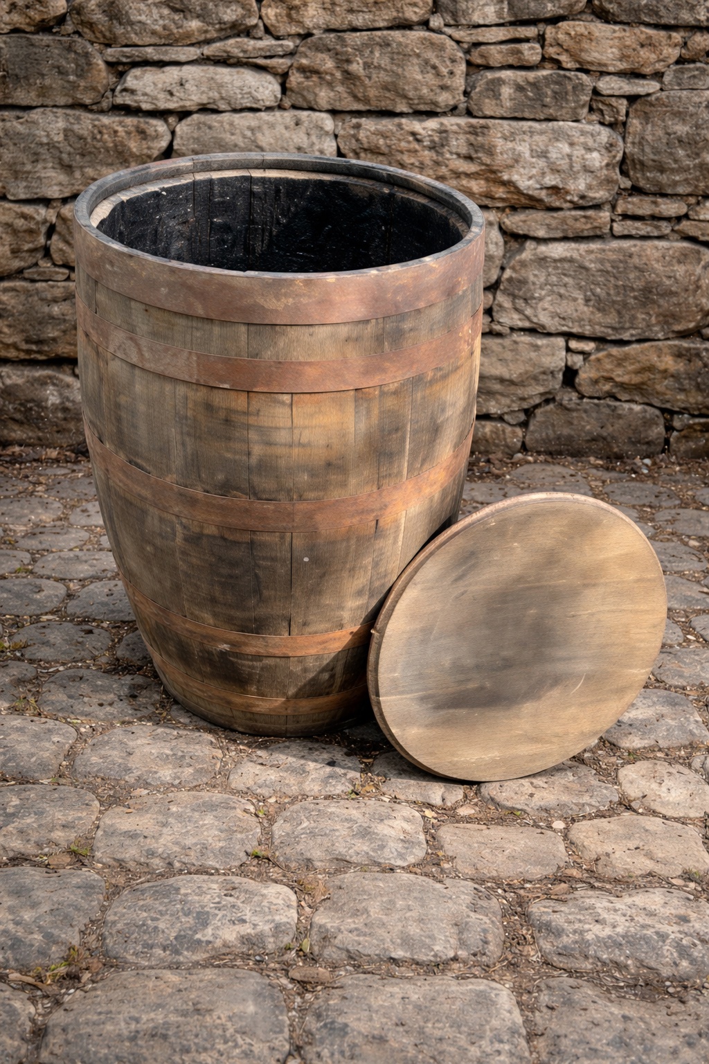 Echtes Whisky-Fass aus Eiche – robust, langlebig und mit authentischem Charakter. Jede Tonne war zuvor im Einsatz und wurde für die Nutzung als Regentonne fachgerecht geöffnet und vorbereitet.